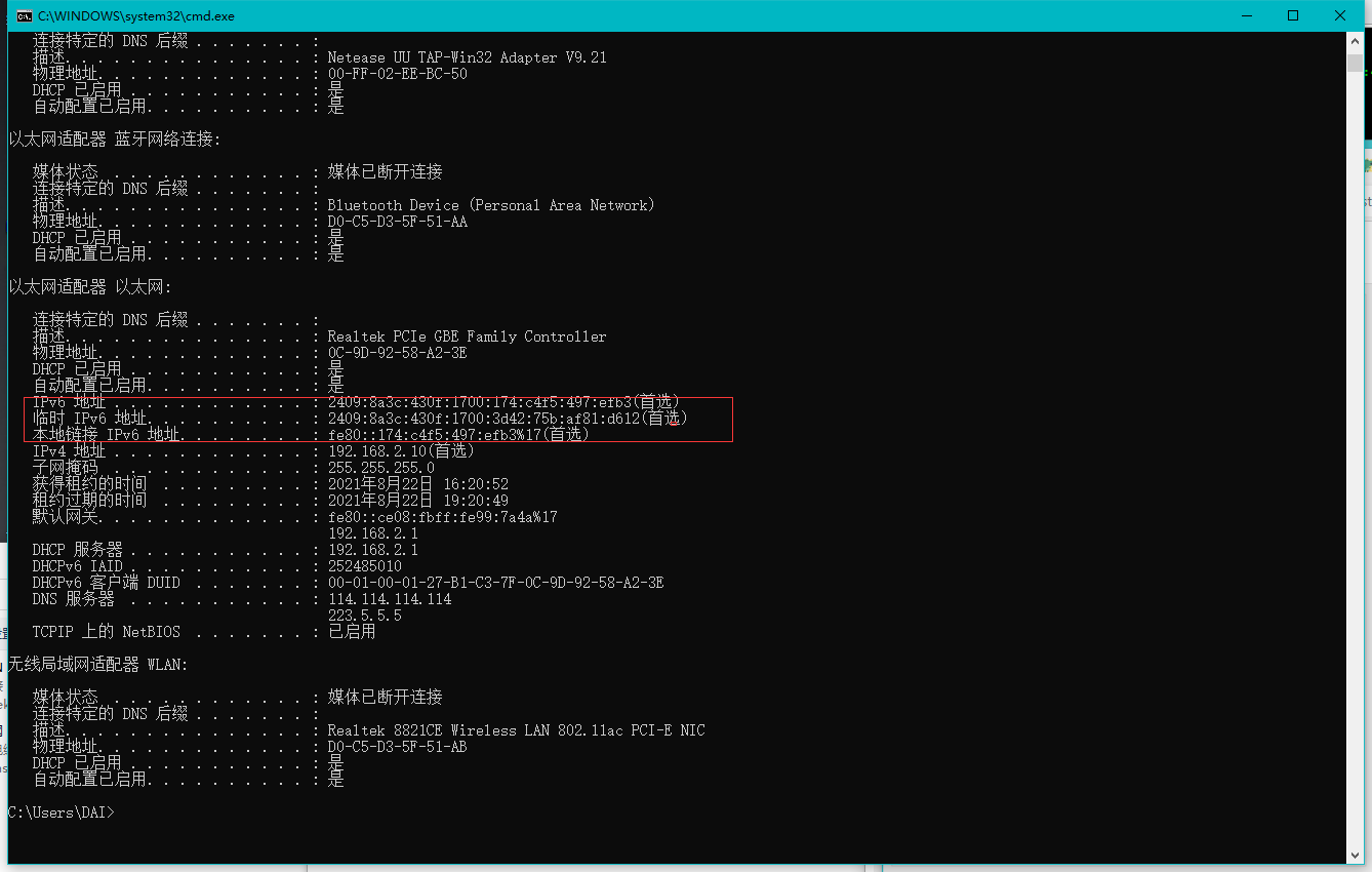 点确定,打开运行 win+r 输入cmd 后输入ipconfig /all查看所有网卡信息,找到接入网络的网卡查看临时 IPv6 地址